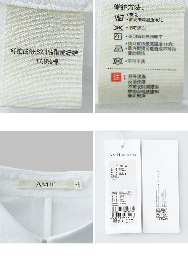 洗涤标准:不可浸泡不可漂白悬挂晾干40℃以下手洗110℃以下熨烫不可干洗