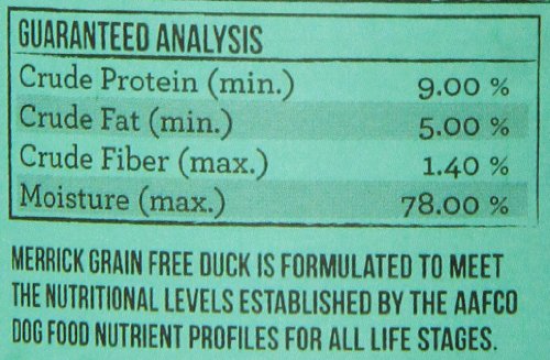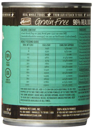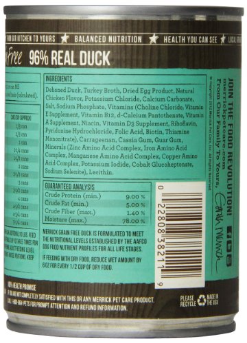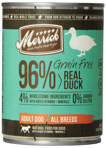 Dogs thrive on quality protein and healthy fats, which is why our Merrick Grain Free 96% Real DUCK Canned Dog Food's first ingredient is real and wholesome USDA-inspected deboned duck. This grain-free, fresh entrée is 96% meat with all the vitamins and minerals your dog needs for complete nutrition. No artificial colors, flavors, preservatives or by-products. Grain-free canned recipes can be served as an excellent topper for dry kibble or a delicious stand-alone meal. Like with all of our recipes, we locally source our farm fresh ingredients to ensure the highest quality. As a result, Merrick recipes don't contain any ingredients from China and our made in our own five-star kitchen and manufacturing facilities that uphold the strict guidelines well defined by the FDA. Dogs thrive on quality protein and healthy fats, which is why our Merrick Grain Free 96% Real DUCK Canned Dog Food's first ingredient is real and wholesome USDA-inspected deboned duck. This grain-free, fresh entrée is 96% meat with all the vitamins and minerals your dog needs for complete nutrition. No artificial colors, flavors, preservatives or by-products. Grain-free canned recipes can be served as an excellent topper for dry kibble or a delicious stand-alone meal. Like with all of our recipes, we locally source our farm fresh ingredients to ensure the highest quality. As a result, Merrick recipes don't contain any ingredients from China and our made in our own five-star kitchen and manufacturing facilities that uphold the strict guidelines well defined by the FDA.