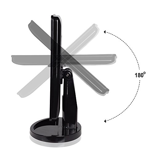 A full 180-degree rotation mirror. Adjusting all kinds of view angle optionally. Storable base to hold lipstick, sponges and ect.