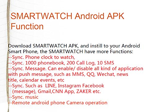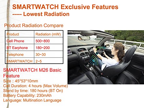 This is a new Bluetooth Smart M26 Watch which is compatible with all Bluetooth V3.0(Minimum version 3.0) or above. It can work with Android with all functions and download the app. This watch can be connected by bluetooth with smartphones, tablets and PCs, such as Sumsung S3, S4, Note 2, Note 3, Note 4,LTC,LG etc. Features 1.48" Capacitive Touch Screen TFT LCD Time/Date/Week/Battery state display Ringing reminder when you receive a call Ringing reminder once your mobile phone disconnected Display the number or name of incoming calls Answer or Dial calls from watch Support hands-free calls, phone book Play the music in your phone Sync SMS/call history(only for android phone, you need download apk) Ring reminder when your smart phone receive a message (including Wechat, Facebook, Twitter, WhatsApp, Skype, and so on. Only for android phone.) Anti-lost alarm function: When cellphone left watch alarm automatically, after a certain distance to avoid lose the phones Remote taking photo function: You can control your cellphone to take photo from the watch.(only for android phone) Stopwatch, Altitude Meter, Passometer, Photograph, Barometer, Vibration Bluetooth Version: V3.0+EDR Bluetooth Protocol: A2DP + HFP 1.5 + HS P 1.2 Range of Frequency: 2.4GHz spectrum Ambient Noise: ¡Ü75dB Transmitting Range: ¡Ý10mFeature