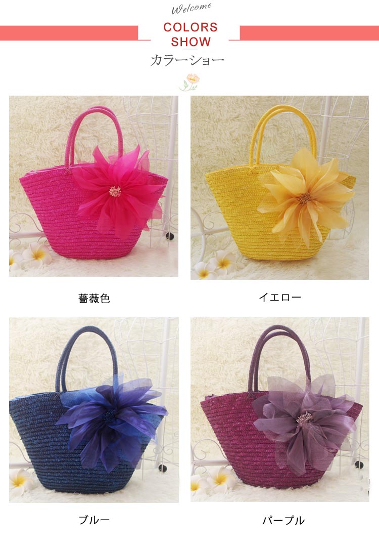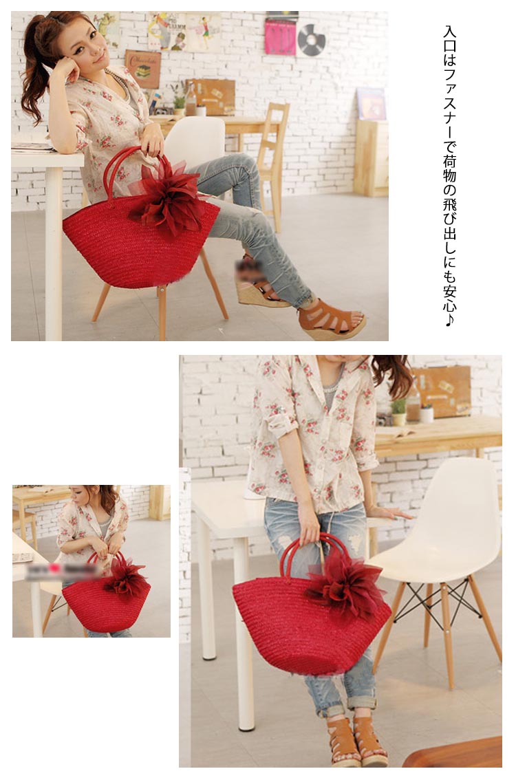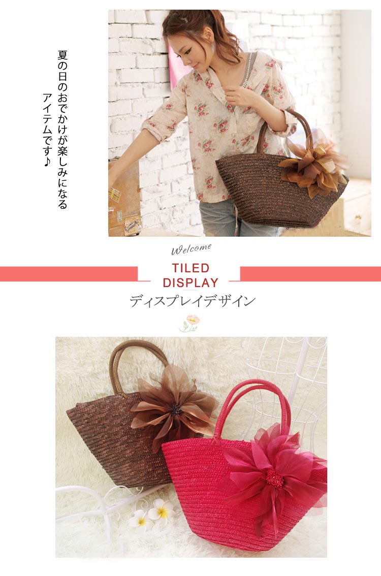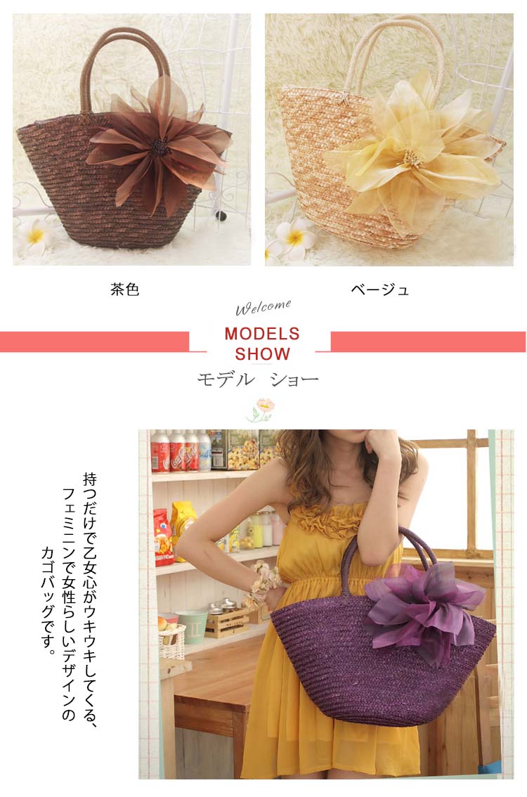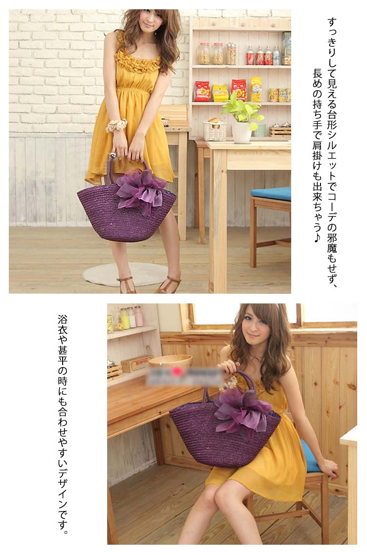 | 持つだけで乙女心がウキウキしてくる、フェミニンで女性らしいデザインのカゴバッグです。 すっきりして見える台形シルエットでコーデの邪魔もせず、長めの持ち手で肩掛けも出来ちゃう♪ 浴衣や甚平の時にも合わせやすいデザインです。 入口はファスナーで荷物の飛び出しにも安心♪ 夏の日のおでかけが楽しみになるアイテムです♪ | |