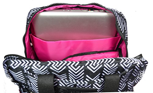 Eight pockets for maximum organization: dedicated pump pocket, expandable water bottle pocket, three pockets on front (slip pocket, zip pocket with key fob, velcro pocket), large pocket down the back to hide backpack straps or other use, interior zip pocket, interior padded laptop pocket.