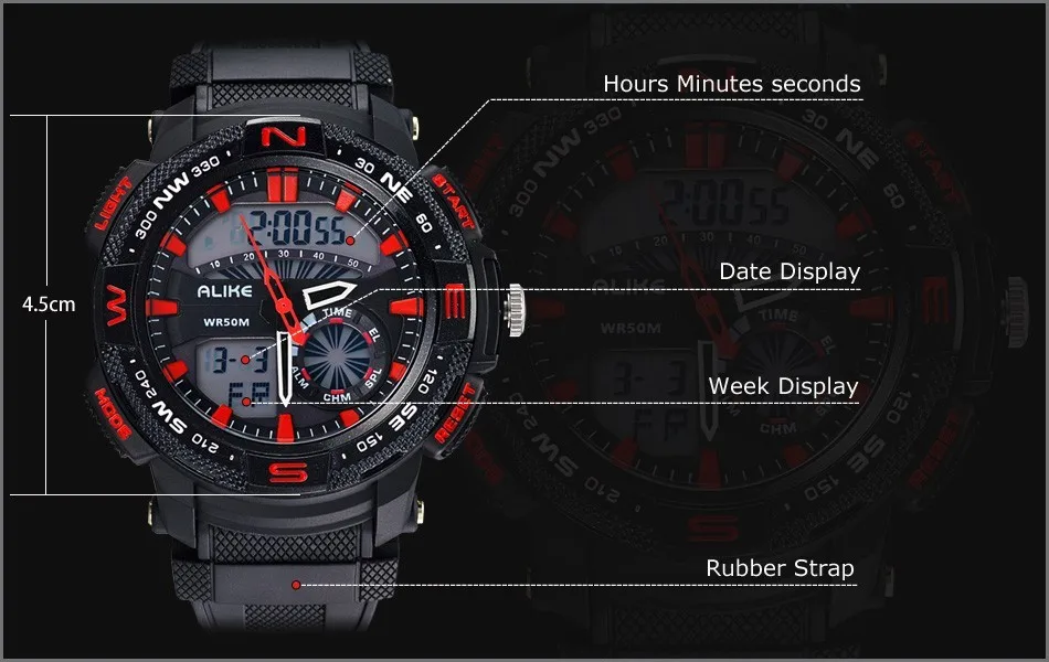 Feature:Water Resistant,LED display,Luminous,Stop Watch,Back Light,Complete Calendar,Shock Resistant,Chronograph,Perpetual Calendar,Auto Date,Week Display,Alarm,Swim