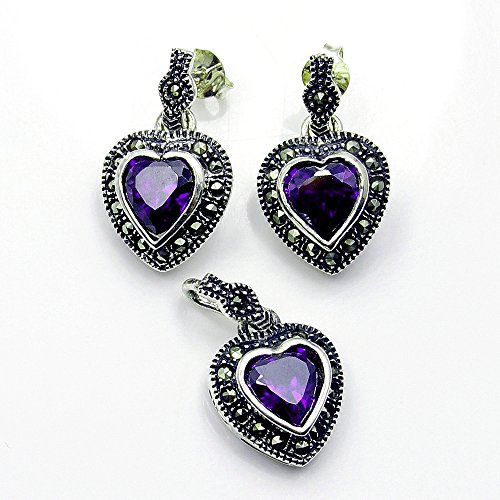 -. Binding : Jewelry -. Brand : The Silver Plaza -. Department : womens -. Feature : Marcasite, Cubic Zirconia; Pendant: 0.85" long, 0.5" wide; Earrings: 0.85" long, 0.5" wide / .925 Sterling Silver; Weight of set: 8.8 grams / Each item comes shipped in a jewelry box. / You are looking at a one of a kind piece. / Each item is designed and handcrafted by our artisans. -. Model : Z149 -. MPN : Z149 -. PartNumber : Z149 -. ProductGroup : Jewelry -. ProductTypeName : FINEEARRING -. Title : 'Queen of Hearts' Sterling Silver Purple CZ, Marcasite Earrings & Pendant Set