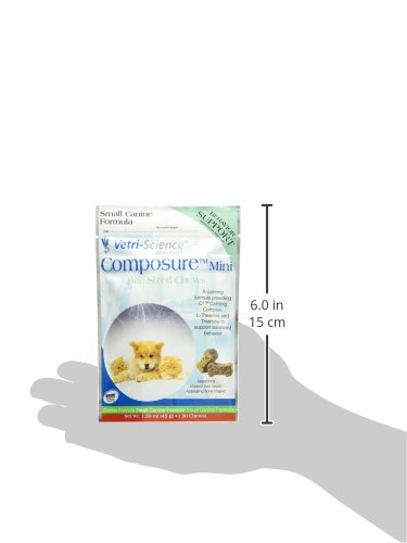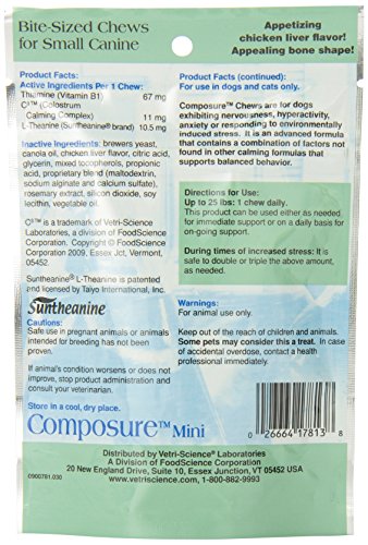 -. Binding : Misc. -. Brand : VetriScience Laboratories -. Color : tan -. Department : dog-stress-anxiety -. EAN : 0400802051994 -. Feature : A calming support formula recommended for dogs exposed to increased environmental stressors / Helps alleviate stress-related behavior problems without affecting your animal's personality or energy level / Can be used daily or when extra help to relax is needed / These chews are for canines only / Packaging May Vary -. Label : Vetri-Science Laboratories -. Manufacturer : Vetri-Science Laboratories -. Model : 0900781.030 -. MPN : 900781.03 -. NumberOfItems : 1 -. PackageQuantity : 1 -. PartNumber : 900781.03 -. ProductGroup : Pet Products -. ProductTypeName : PET_SUPPLIES -. Publisher : Vetri-Science Laboratories -. Size : 30 Count -. Studio : Vetri-Science Laboratories -. Title : Vetri-Science Composure Small Canine, 30 Mini Bite-Sized Chews -. UPC : 026664178138