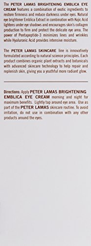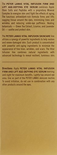 -. Feature : Peter Lamas Firm and Lift Age-Defying Eye Serum minimizes fine lines, reduces puffiness and firms fragile eye tissue / Peter Lamas Naturals Brightening Emblica Eye Cream helps brighten dark circles, diminishes fine lines and wrinkles and firms fragile eye tissue / 100% vegan / Contains natural botanicals / Included: Peter Lamas Vital Infusion Firm and Lift Age-Defying Eye Serum (0.5 fluid ounce) and Peter Lamas Naturals Brightening Emblica Eye Cream (0.5 fluid ounce)