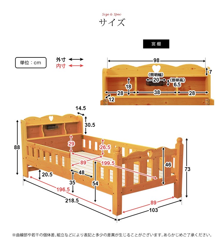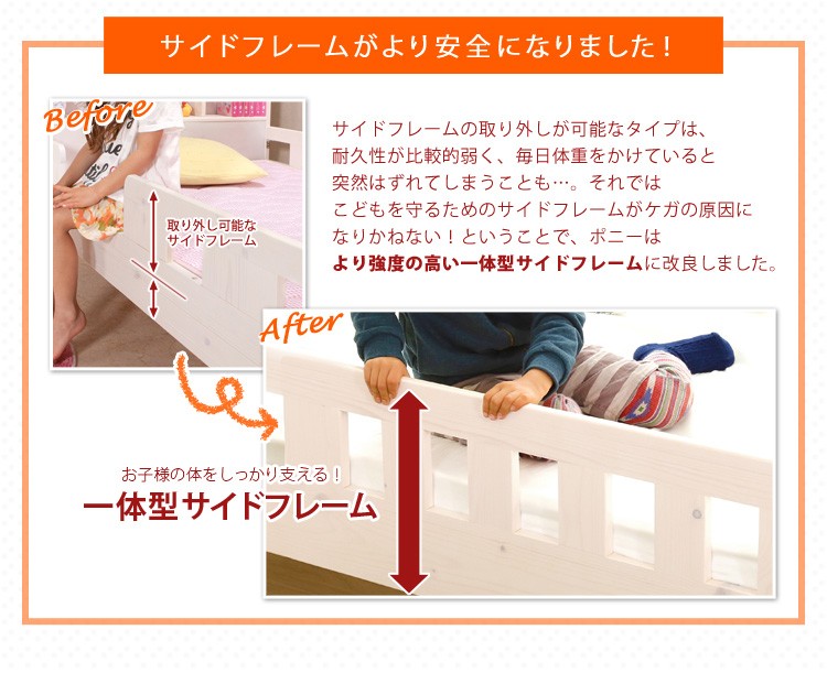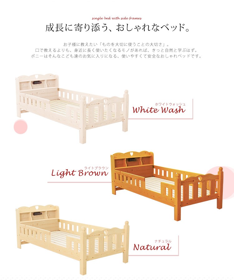 【商品について】サイドフレーム付きシングルベッド【Pony-ポニー-】(ベッド シングル サイドフレーム)■サイズ:外寸:(約)幅103x奥行218.5x高さ88cm※商品重量:(約)39.8kg■カラー:ホワイトウォッシュ ナチュラル ライトブラウン■素材:本体:天然木(パイン材) / すのこ:天然木化粧合板(LVL)表面材:ラッカー塗装■その他:・お客様組立商品です・梱包サイズ:(3-1)(約)111x92x23cm(3-2)(約)204x48x6.5cm(3-3)(約)102x100x7cm・梱包重量:(約)46.8kg