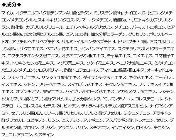 1つで「ファンデーション」「化粧下地」「UVカット」「フィニッシングパウダー」「保湿パウダー」「コンシーラー」の6つの働きをするミネラルBBパウダーです。微粒子パウダーの光拡散効果により、肌を明るくしツヤ肌を演出してくれます。3種類のヒアルロン酸など77種類の保湿成分が、肌の表面から角質層まで潤いを与えます。 |
