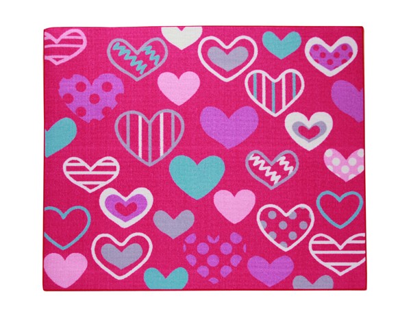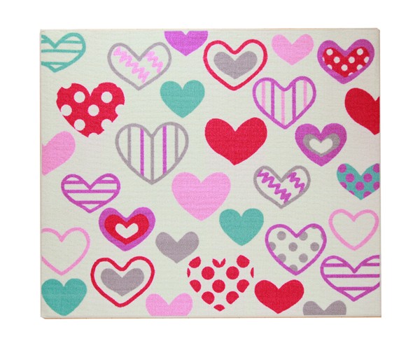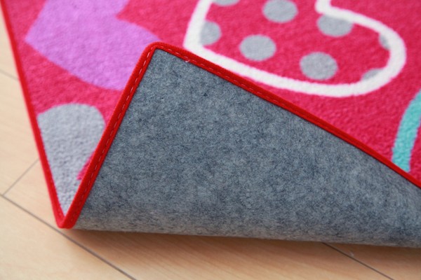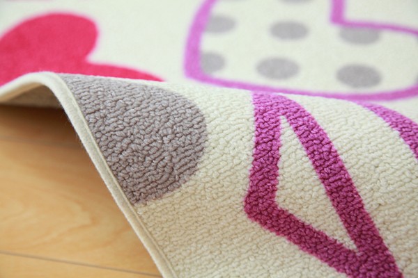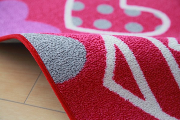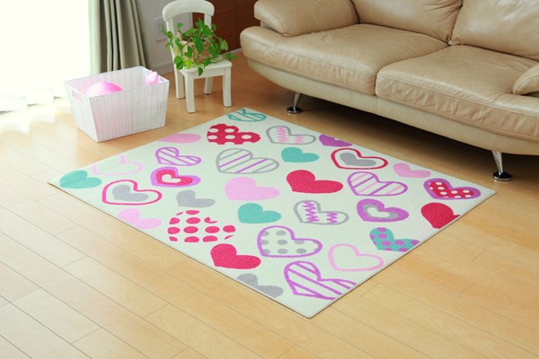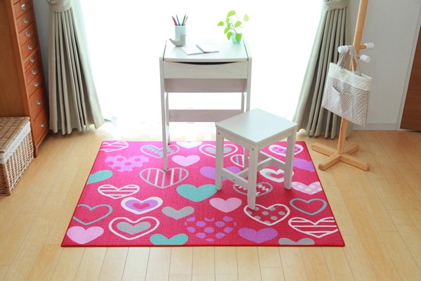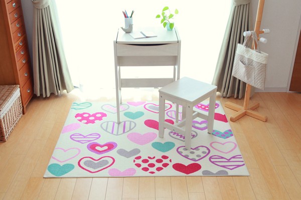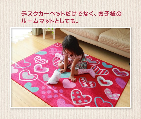 学習机用のデスクカーペットです。かわいらしいハート柄が特徴です。表地はループタイプになっており、毛足が短く掃除がしやすい仕様になっています。裏地には不織布を使用していますので、フローリングが傷つきにくいです。お子様の学習机の下や、ベッドサイドなどにお勧めの商品です。