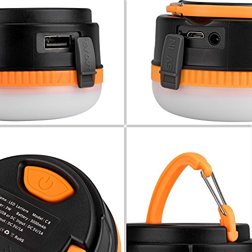 Innovative Design -Rechargeable Camping Light with 5V Output!! So it can work as a power bank for charging your phone while meantime lighting up in the dark! With rechargeable battery of 3000mAh super high capacity. Only takes 2.5 hrs to fullly recharge.