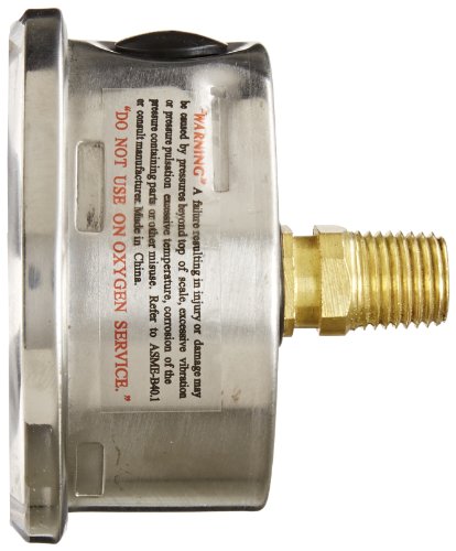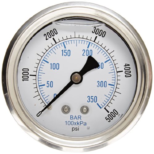 PIC Gauge 202L-254R Glycerin Filled Industrial Center Back Mount Pressure Gauge with Stainless Steel Case, Brass Internals, Plastic Lens, 2-1/2" Dial Size, 1/4" Male NPT Connection Size, 0/5000 psi Range