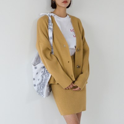 실용성이 돋보이는 니트 세트 아이템입니다. 피부에 거슬리지 않는 촉감의 아크릴 혼방 소재로 부담스럽지 않게 착용되어집니다. 가디건은 전체적으로 루즈한 핏감으로 바디 라인에 따라 여리한 핏감으로 착용되어지며 힙선을 덮는 기장으로 세트인 니트 치마로 자칫 부담스러울 수 있는 힙라인을 깔끔하게 가려주어 편하게 착용할 수 있습니다. 치마는 너무 짧지 않은 기장으로 안정감 있으며 밴딩 부분이 깔끔하게 처리되어 상의를 모두 넣어 입어도 단정해 보입니다. 베이직한 컬러와 포인트 컬러의 구성으로 선택의 폭을 넓혀주었습니다.