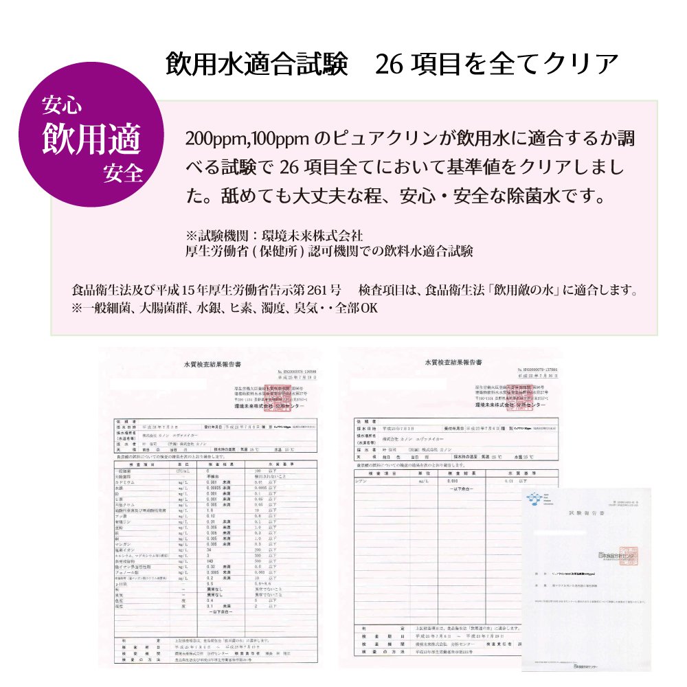 Pure CLEAN cleared all the criteria for all 26 items in the test whether it conforms to drinking water at the Certification Bureau of the Ministry of Health, Labor and Welfare.