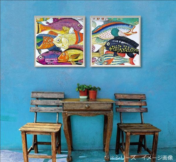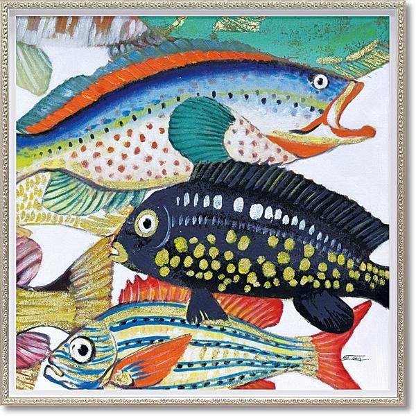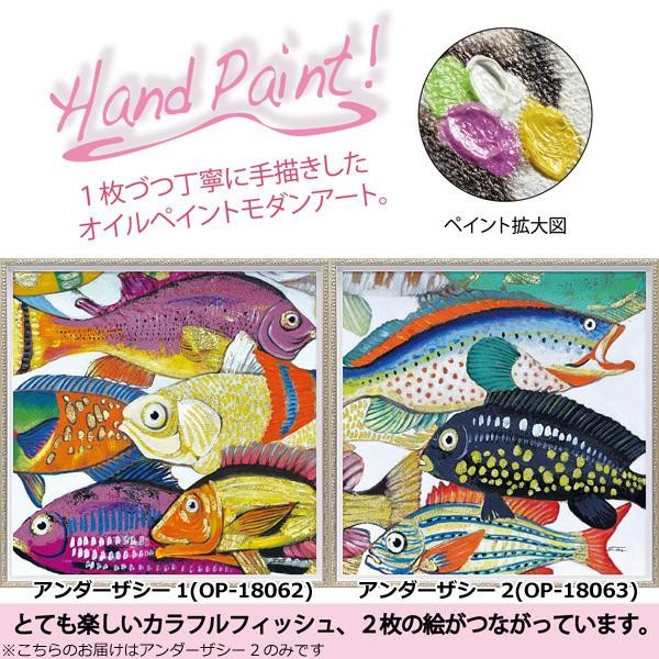カラフルにハンドペイントされたキャンバスを、リッチなフレームにセットしたモダンアートです。別売の「アンダー ザ シー1」と合わせて飾ると、1枚の絵のようになります☆ |