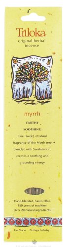 Triloka Original hand-rolled & blended natural herbal incense Myrrh- EARTHY SOOTHING Fine, sweet ,resinous fragrance of the myrrh tree blended with sandalwood, creates a soothing and grounding energy. 10 sticks per pack.
