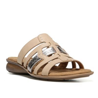 Binding : Apparel Product Description Take a casual look to the next level with these Joliet wedge sandals from NaturalSoul by naturalizer. The All-Thru Comfort System features memory foam, arch support and soft cushioning throughout to surround your feet in ALL DAY comfort. SANDAL FEATURES Backless design Metallic snakeskin accent strap Cushioning arch support Non-slip sole for stability SANDAL CONSTRUCTION Synthetic upper Fabric lining Manmade outsole 0