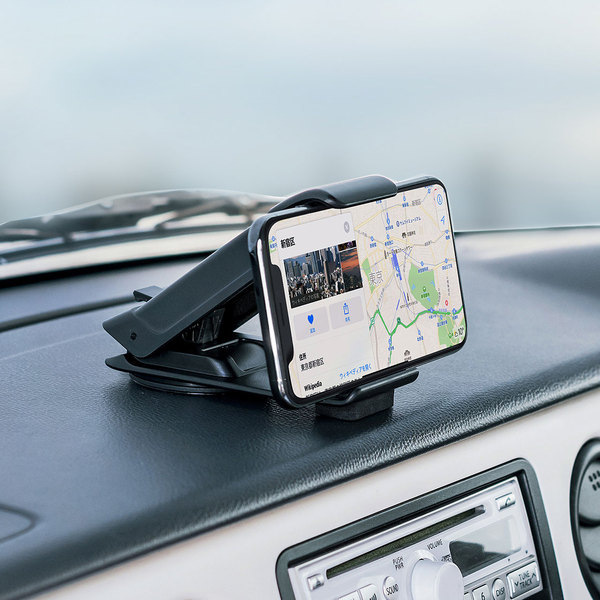 ●ゲル吸盤でダッシュボードに強力固定できる車載ホルダー。スタンドレスで視界を遮りにくい薄型タイプ。