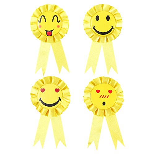 4-PACK SMILEY FACE ROSETTE RIBBONS: This pack of Rosette Ribbons includes 4 different smiley face ribbons. These Ribbons come in yellow and features one smiling face with hearts for eyes, one regular smiling face, one love-dazedface, and one ecstatic face.