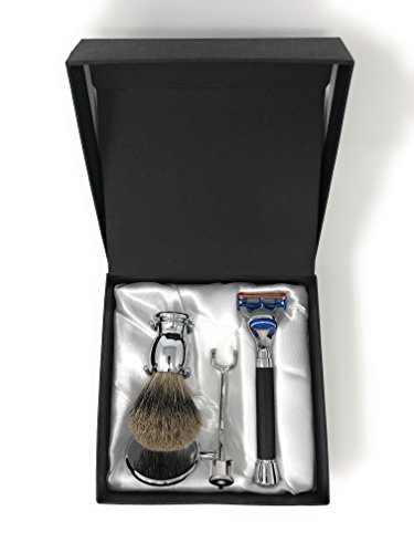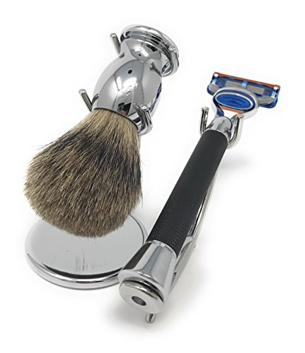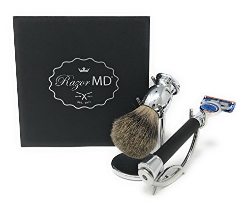 WHAT's INCLUDED: Equipped with a handmade laser-engraved handle for a secure grip, this handsome razor set ensures a smooth and comfortable shave everytime. The set includes a matching chrome Best Badger-hair shave brush and a sleek chrome shave stand for display. This 3-piece will come package in a Razor MD signature gift box.