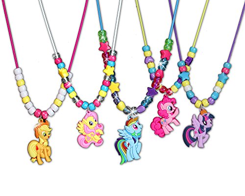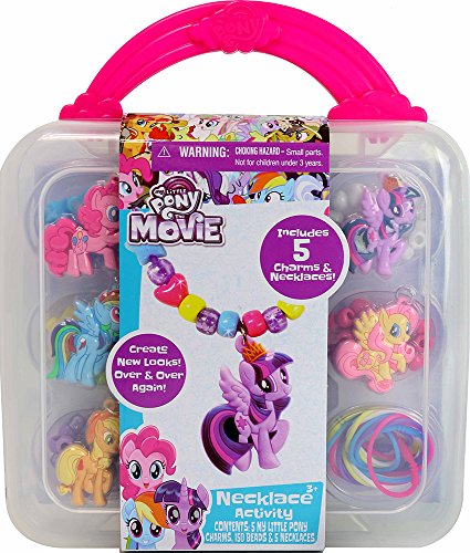 Design your very own My Little Pony necklaces with this fun easy to use set! Simply slide the beads and character charms through the silicone necklaces. Mix and match the colorful beads and character charms to create new looks over and over again! Everything stores neatly inside the plastic carry case which includes a sturdy handle for on the go fun.Feature