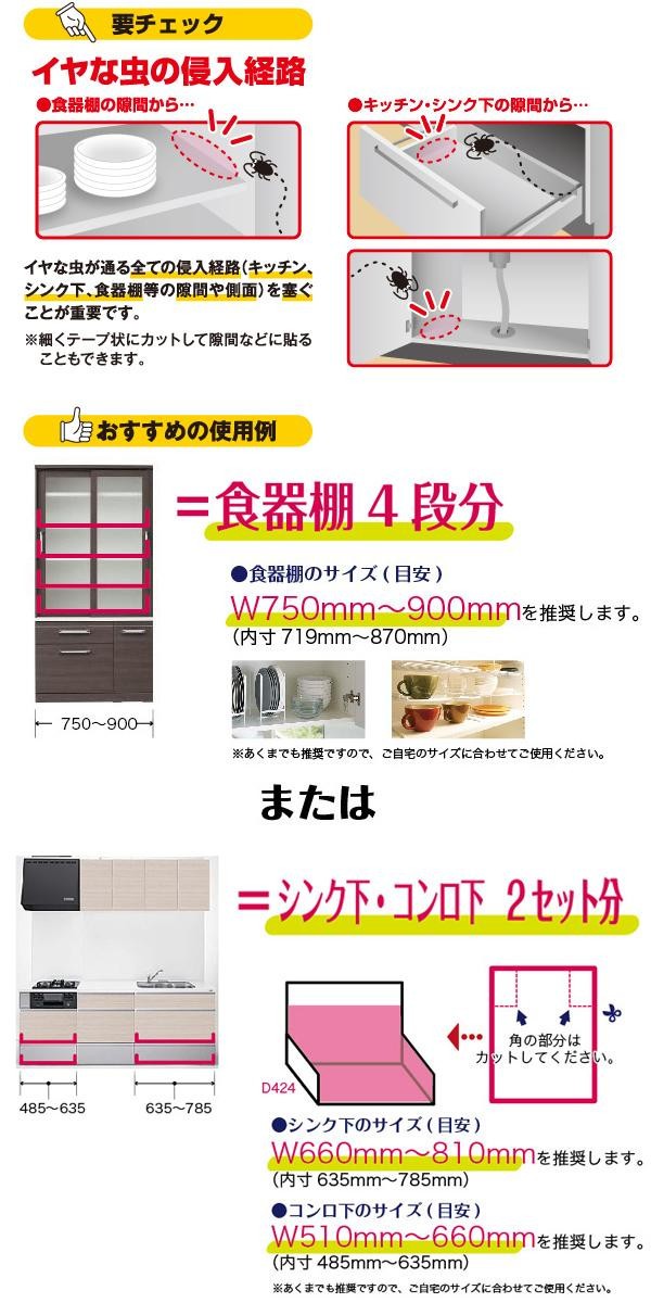 | 裏面微粘着加工で、棚の側面やシンク下、壁にも簡単に貼ることができるので壁からのゴキブリの侵入をガードします。シートは半透明ですので、お部屋や家具の雰囲気はそのままに防虫することが出来ます。 |