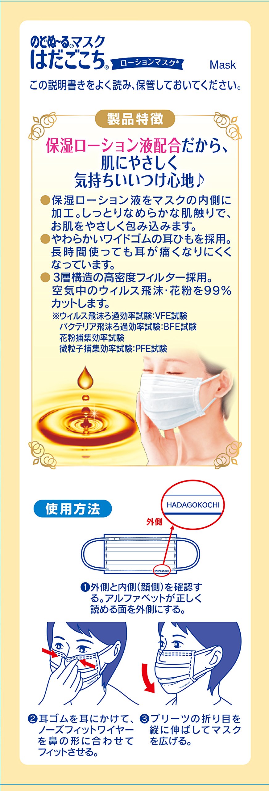 ● Since weak acidic moisturizing lotion is applied to the inside of the mask, wraps your skin gentle with a supple and moist texture ● With high-density filter function, scatter viruses in the air · cut pollen by 99%