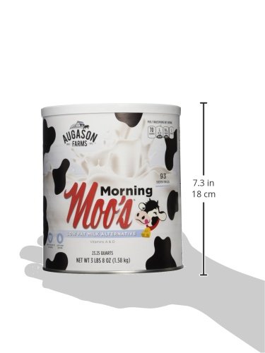 The (No Suggestions) farms morning moo's low fat milk alternative is as delicious as it is nutritious. This whey-based beverage looks and tastes like milk, with calcium and added vitamins comparable to 2% milk. Morning moo's is great for drinking or to be used in any recipe that calls for milk. Or try this mouthwatering holiday favorite: morning moo's served steaming hot with brown Sugar and pumpkin spice. Morning moo's also serves as an excellent substitute for light cream-add only half the recommended water. With a 25 year shelf life, morning moo's is ideal for everyday use or long term food storage. No matter the case, this #10 can is an absolute essential in an emergency: it's easy to transport and includes all your food storage needs. Make the wise decision and let (No Suggestions) farms give you a peace of mind that's as indispensable as it is delicious. Family owned and operated since 1972, (No Suggestions) farms believes that great taste is a tradition worth preserving. They'll provide you with delicious peace of mind with their food essentials. Augason farms recognizes that today's consumers are more concerned than ever before about what kind of foods they eat, and want to provide their families with food that is safe and the best quality. Please discard oxygen absorber after opening. Best when stored in a cool dry place at temperatures between 55 degree and 70 degree F (ideal humidity 15%).Feature