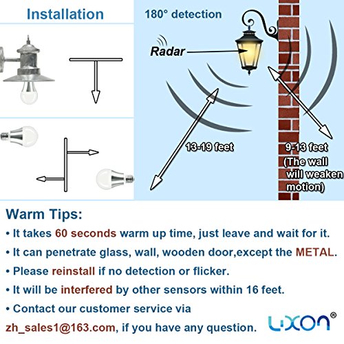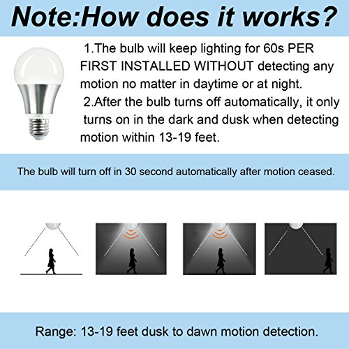 - ②Energy Saving Work Mode:★This motion sensor light bulb will KEEP lighting for 40-60s PER EVERY INITIAL INSTALLATION WITHOUT detecting any motion no matter in daytime or at night.★Then the bulb turns off automatically, it only turns on in the dark and dusk when detecting motion within 13-19 feet, and auto turn off in 30 seconds after the motion ceased or disappeared.