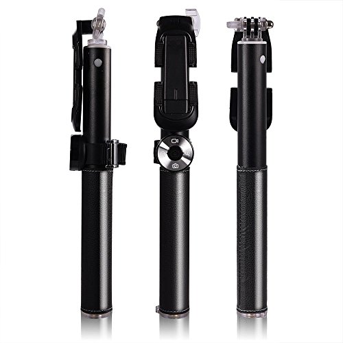 -. Feature : ★24.5-95cm Adjustable Selfie Stick, w/5-8.2cm flexible clip & safety band, anti-slip, holds your phone steadily and safely, suitable for most smartphones among 4.0-5.5 inches / ★Detachable & Rechargeable Bluetooth Shutter, through the "BT Shutter" App,IOS phones can achieve the function of shooting,zooming,front/rear camera switch, picture/ video switch ,while the Andriod phones support shooting and zooming function only / ★3 in 1 Clip Lens: wide lens 0.67X, 180° fisheye lens and 1.0-2.0cm distance of macro lens, makes your selfies more special and unique / ★Extra Tripod is applicable to GoPro/action cameras with trigeminal PTZ, can be used as a bracket for pictures/videos shooting / ★Personalized PU Leather Handle w/a Waterproof Pouch and stick strap, easy to carry, ABS+aluminum alloy materials, comfortable high-grade hand feeling, lightweight and durable