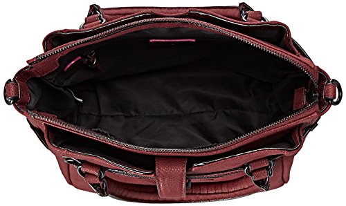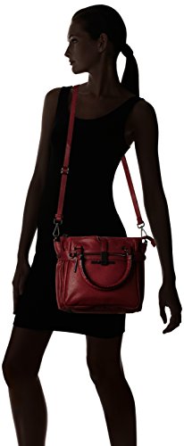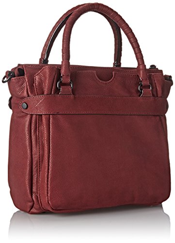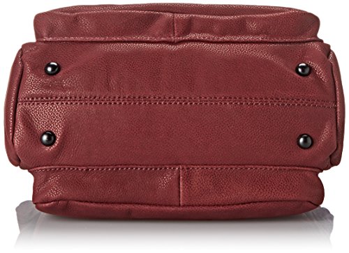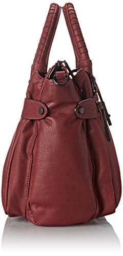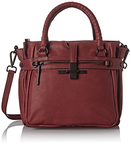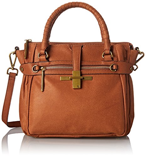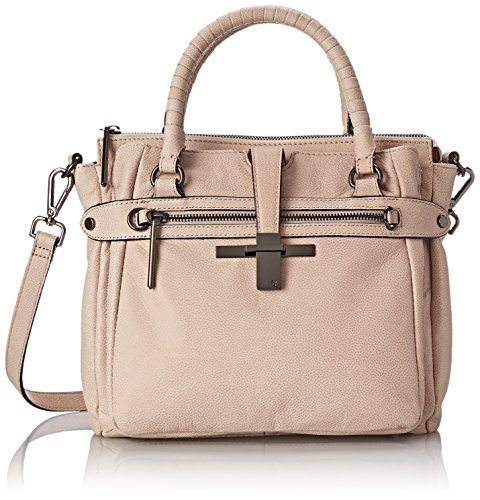 Pebbled-leather bag featuring textured top handles, snap-out expandable side panels, footed bottom, removable cross-body strap, and front slip pocket with metal tab closure