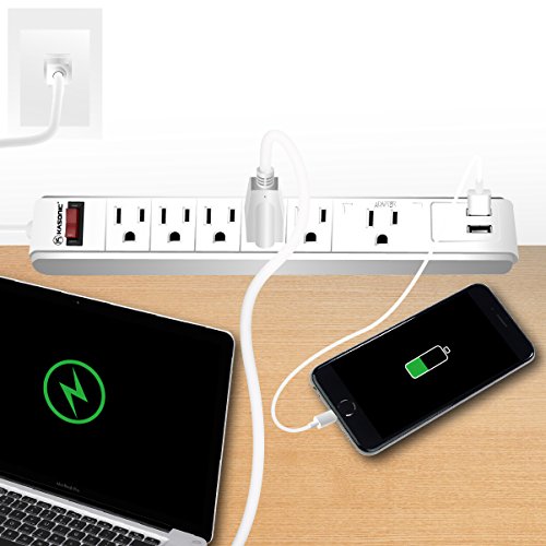 - SIX OUTLETS & DUAL USB PORTS- This comprehensive 6-Outlet Surge Protector with Dual-USB 2.1Amp Charging Ports has maximum capacity of 1875 watts. It has a widely-spaced outlet that accommodate large transformer plugs without blocking other outlets.