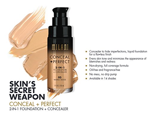 -. Binding : Misc. -. Brand : Milani -. EAN : 8111160974581 -. Feature : Combat under eye circles, redness and other skin imperfections with this full coverage, water-resistant foundation plus concealer in one. / A no mess, no drip pump dispenses just the right amount of fluid needed to achieve a flawless look and works around the clock to keep skin looking naturally perfect! / Net Wt. 1 fl oz / 30 mL -. IsAdultProduct : 0 -. Label : - -. Manufacturer : - -. MPN : - -. PackageQuantity : 1 -. PartNumber : - -. ProductGroup : Beauty -. ProductTypeName : BEAUTY -. Publisher : - -. Studio : - -. Title : MILANI Conceal + Perfect 2-In-1 Foundation + Concealer – Chestnut