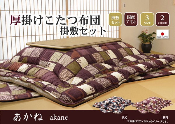 【商品名】国内プリント こたつ厚掛け布団・敷布団セット 『あかね』 ブラック 205×205cm(裏地:フランネル)