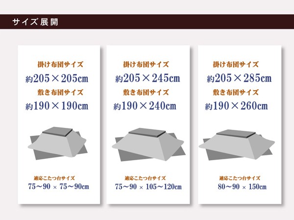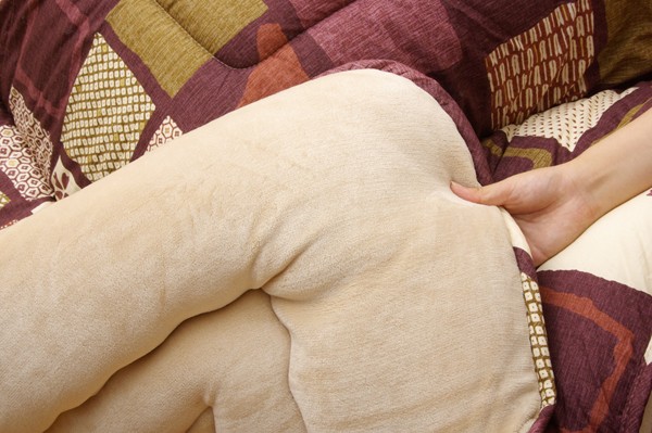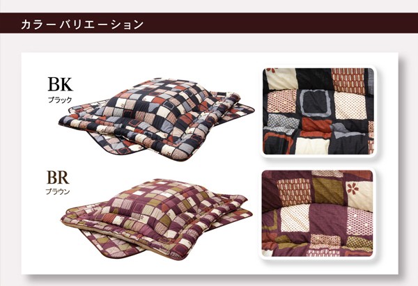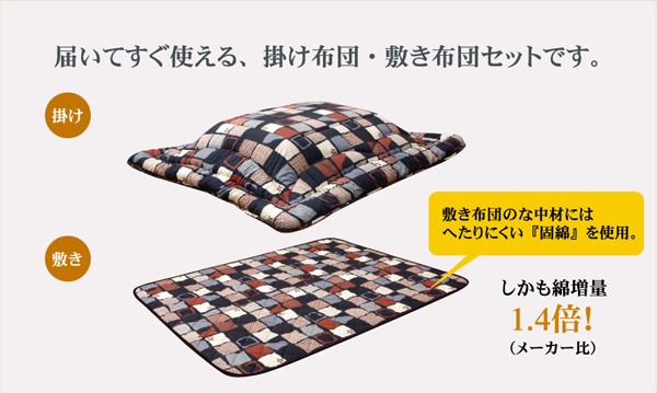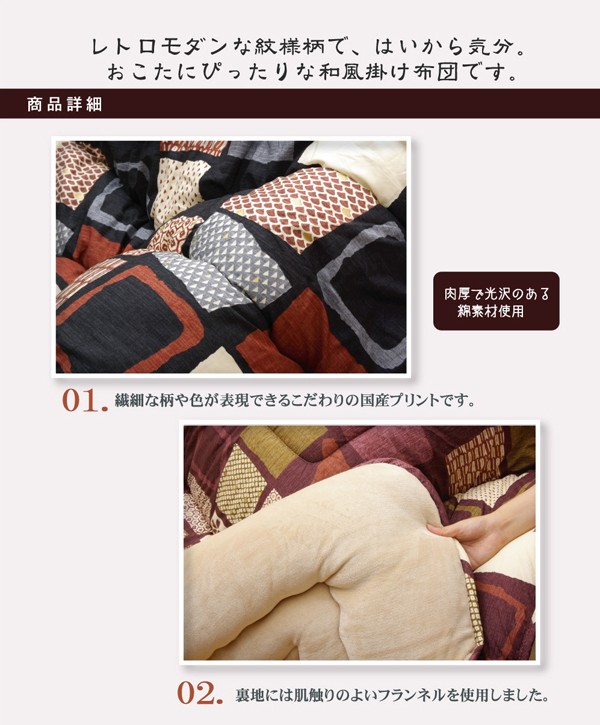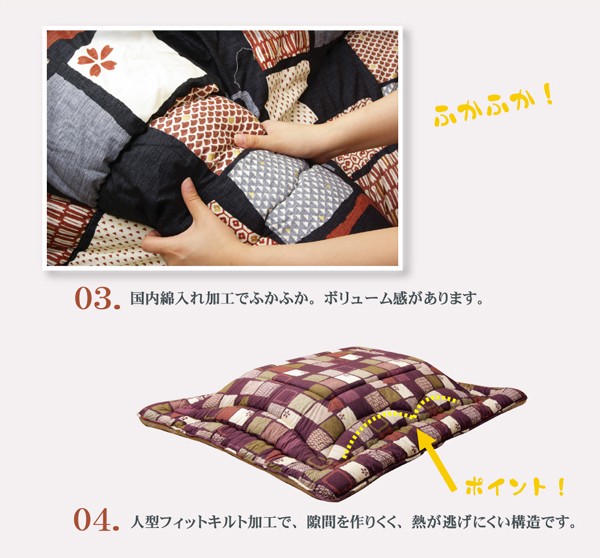 和モダン柄の日本製こたつ布団です。こちらの商品は国内でプリント、綿入れをしています。日本製のプリントらしい上質な質感と繊細な柄をお楽しみ下さい。生地には肉厚で張りと光沢のある綿素材を使用しています。綿はポリエステルに比べ静電気が起きにくく、繊維の中でも特に肌触りがよいのが特徴です。暖かさにもこだわり、裏地にはフランネルと呼ばれる、しっとり柔らかな肌触りの生地使用しています。また、敷き布団の中材のポリエステルわたの重量は、一般的な重量の(メーカー比)約1.4倍の増量タイプで、しかも通常のわたよりもヘタリにくい、固わたを使用しています。コタツに出入りする際に熱が逃げにくいフィットキルト加工を施しています。部分暖房のこたつは電気代もおトクです。