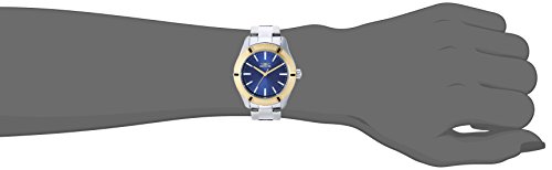 Blue metal sunray dial with gold hands and white hour markers, steel stainless steel band and push crown