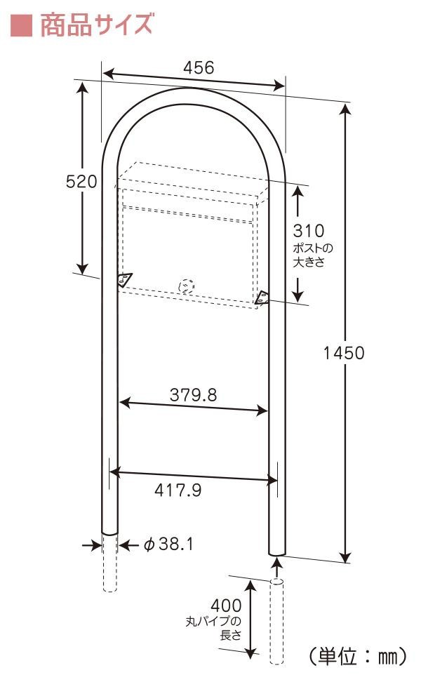 | 付属品 | ポスト取付底板(台座)、表札プレート、埋め込み用丸パイプ×2 【取付金具】 六角ボルト・ちょうナット・平ワッシャー・スプリングワッシャー×各10、 丸パイプ固定用六角ボルト×2 |