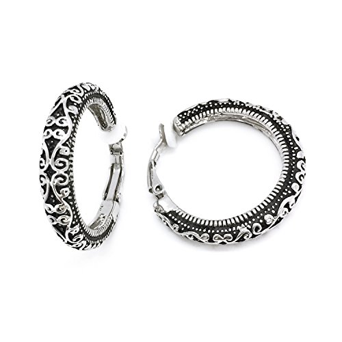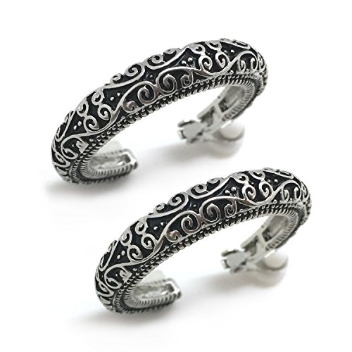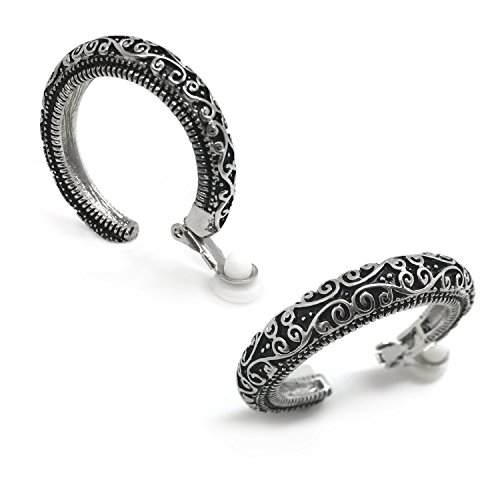 Made of rhodium plated alloy, these hoops are showcasing a vintage antique look with scrolls swirling along the length of each hoop. Measures about 6mm wide with diameter of 1.25" and secured with clip on backings. These earrings can be worn dress up or dress down to complement your attire. These fashion clip on earrings will make the perfect choice for your special someone for Valentine's gift, Christmas gift, Mothers day gift, Birthday gift, Anniversary Gift, or Bridal party gifts.Feature