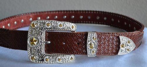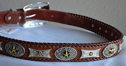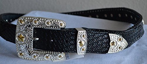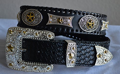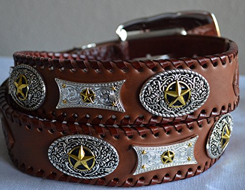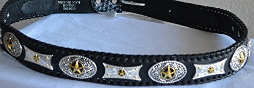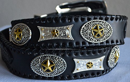 Binding : Apparel Product Description Brand new leather texas star concho buckle belt. The entire belt strap is beautifully designed on engraved two tone star conchos, edge of the belt decorated with genuine leather whip stitch accent. Beautiful contrasting basket weave trim, removable star detailed rhinestone buckle set. 0