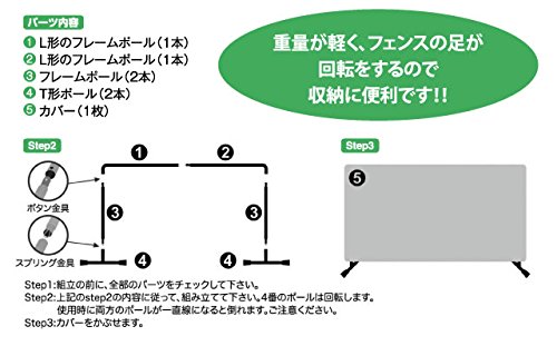 ■크기:높이75cmX폭140cm ■폴 직경:약15mm ■무게:약1.3kg ■폴:철,커버:폴리에스텔 ■파트의 내용 L형의 프레임 폴(1개) L형의 프레임 폴(1개) 프레임 폴(2개) T형 폴(2개) 커버(1매) ■중량이 가볍고, 펜스(fence)의 발이 회전 하므로 수납에 편리합니다.중국