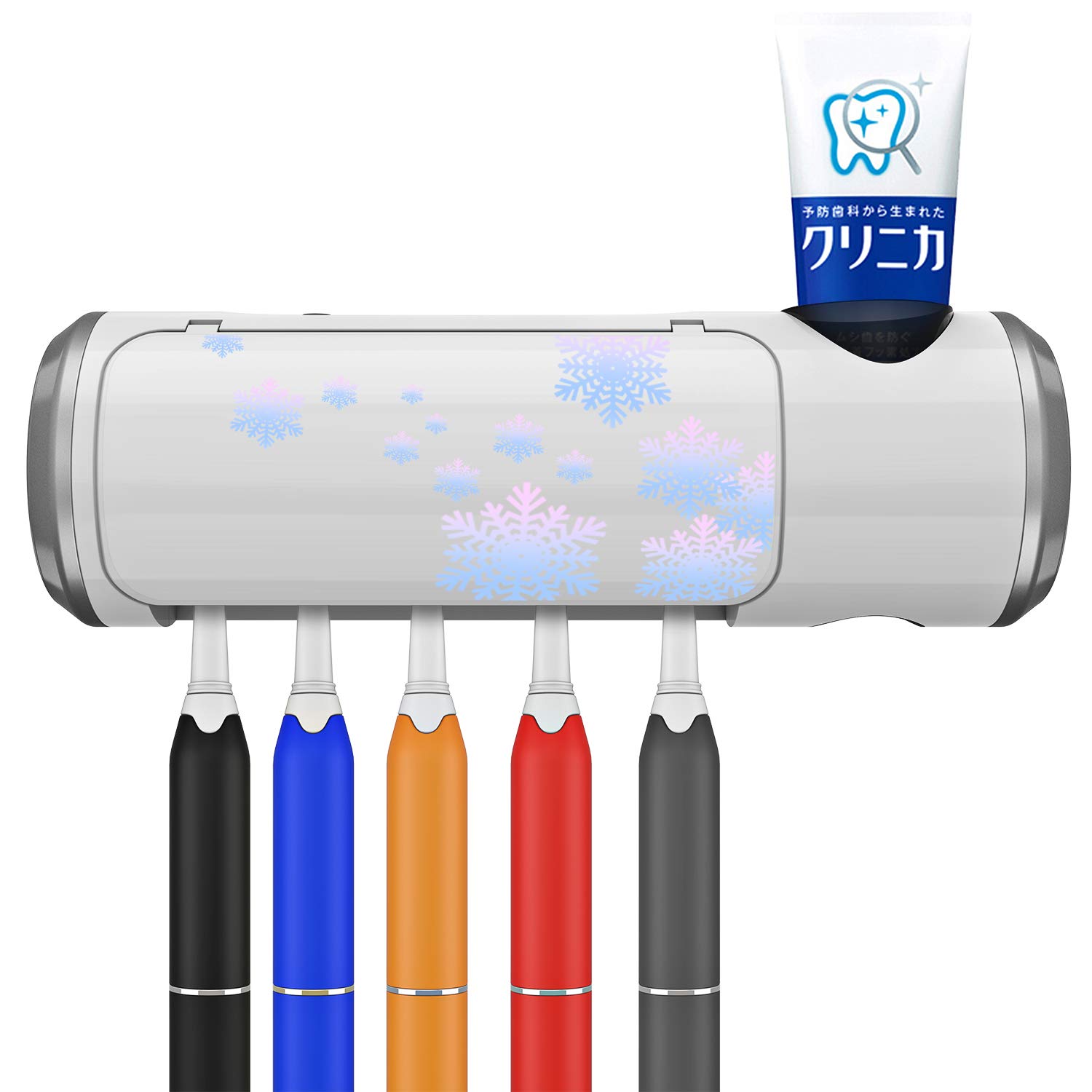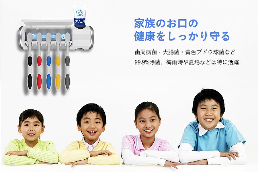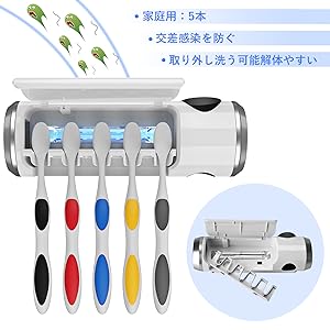 歯ブラシまたは電動歯ブラシヘッドを同時に5本まで、歯磨き粉のチューブも一本格納できて、1台で家族皆で使用でき、家族全員のお口の健康をちゃんと守る!