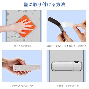 2. 粘着テープのシールを外して、壁にしっかり貼り付ける。(フックの方向は上に向く)