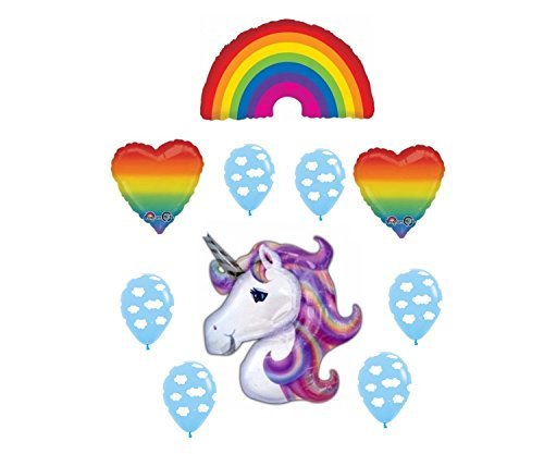 -. Feature : Unicorn Rainbow Party Balloon Decoration Kit Includes: / (1) 36" Rainbow Mylar Balloons (1) 32" Unicorn Mylar Balloons / (2) 18" Heart Shaped Mylar Balloons / (6) 11" blue Clouds Latex Balloons