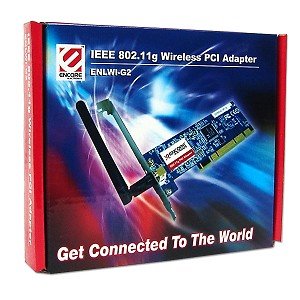 -. Binding : Personal Computers -. Brand : Encore -. EAN : 0852189001541 -. Feature : Transfers data at a rate upto 54Mbps (5X faster than 802.11b standard) Provides backward compatibility with 802.11b standard / Supports WPA and 64/128 bit WEP data encryption for network security Provides easy-to-use installation and configuration tool via web browser / Transfers large digital video and MP3 file with ease Upgrades a desktop PC into a wireless workstation / Radio Technology: IEEE 802.11g Orthogonal Frequency Division Multiplexing (OFDM); IEEE 802.11b Direct Sequence Spread Spectrum (DSSS) Interface: 32-bit PCI interface / Transmission Rate: 1, 2, 5.5, 6, 11, 12, 18, 22, 24, 36, 48, 54Mbps (auto sense) Receiver Sensitivity: 54Mbps: Typical -73dBm @ 10% PER 11Mbps: Typical -85dBm @ 8% PER / Wireless LAN Frequency Range: 2412 ~ 2484 MHz ISM band (channels 1 ~ 14) Modulation Schemes: DBPSK/DQPSK/CCK/OFDM / Roaming: Full mobility and seamless roaming from cell to cell Continuous Current Consumption: 240mA typ. For receive mode 530mA typ. For transmit mode / Diagnostic LEDs: Link, Status Driver Support: Windows 98(SE)/ 2000/ ME/ XP Certifications: FCC Part 15.247 for US; ETS 300 328 for Europe -. IsAutographed : 0 -. IsMemorabilia : 0 -. Label : Encore -. Manufacturer : Encore -. Model : ENLWI-G2 -. MPN : ENLWI-G2 -. PackageQuantity : 1 -. PartNumber : ENLWI-G2 -. ProductGroup : CE -. ProductTypeName : NETWORKING_DEVICE -. Publisher : Encore -. SKU : EN-LWIG -. Studio : Encore -. Title : Encore ENLWI-G2 54Mbps Wireless-G PCI Adapter -. UPC : 852189001541