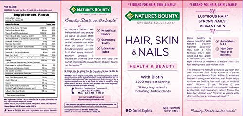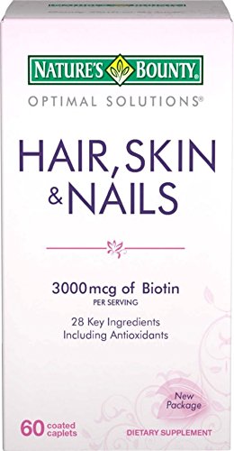 Nature’s Bounty Optimal Solutions Hair, Skin & Nails formula, you’ll look good and feel great! It contains just the right balance of nutrients to help support lustrous hair, strong nails and vibrant skin. This innovative formula provides you with the vital nutrients your body needs to support your natural beauty from within. B Vitamins help with energy metabolism, and Biotin helps to maintain healthy hair and promote healthy nail growth by acting at the base of the nail – the nail matrix – where nail growth begins. Vitamin E and Vitamin C are antioxidants. Vitamin E contributes to skin health, and Vitamin C is involved in collagen production and formation, which forms the basis for vibrant skin. Vitamin A assists with skin maintenance, and overall health.Feature