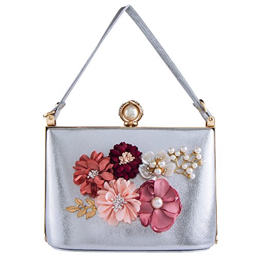 -. Title : Bagood Women's 3D Pearl Flower PU Evening Clutches Purses Handbag for Wedding Bridal Party Silver
