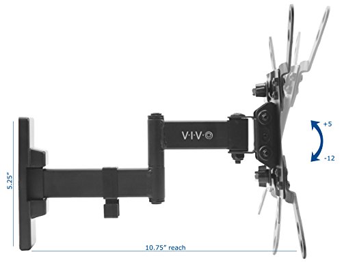 Studio : VIVO Publisher : VIVO Binding : Electronics Product Description MOUNT-VW06 is a fully articulating TV wall mount from VIVO featuring simple assembly and fluid movement for easy screen positioning. This high grade steel mount has a weight capacity of 44 pounds and holds TV sizes 13" to 42". Features include 5 to -12 degree screen tilt and 45 to -45 degree TV swivel for creating the best possible viewing angles, and a cable management system to hold power and video cords. Mount collapses flat against the wall for a low profile and when fully extended sits 14" from the wall. This is compatible with most brand TVs and fits VESA 75x75, 100x100, 200x100 and 200x200. Comes with common mounting hardware.