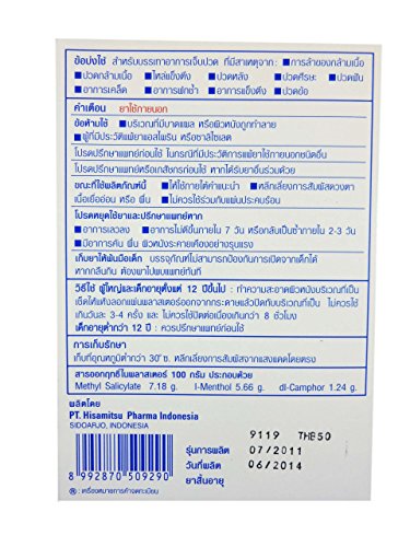-. Binding : Health and Beauty -. Brand : Salonpas -. EAN : 0801739370064 -. Feature : External pain relieving patch / 3 Packs, Packing sheet 10 patches/pack (size of 42x65 mm) / Usage: clean the skin is dry, peeling off the adhesive sheet. * * should not be used over a 3-4 times. And should not be used to close continuously too long 8 hours / "free!! sticker Thai_product, souvenir from Thai_product.,High Quality & Services by Thai_product. " -. IsAdultProduct : 0 -. Label : thailand -. Manufacturer : thailand -. MPN : Sal-7990 -. PartNumber : Sal-7990 -. ProductGroup : Health and Beauty -. ProductTypeName : HEALTH_PERSONAL_CARE -. Publisher : thailand -. Size : 10 patches/pack (size of 42x65 mm) -. Studio : thailand -. Title : 3 Packs of Salonpas (65 Mm X 42 Mm) (10 Patches/pack) -. UPC : 801739370064