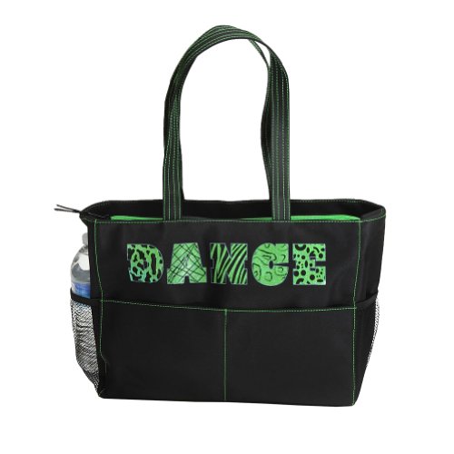 -. Binding : Apparel -. Brand : Horizon Dance -. Department : girls -. Feature : A unique black duffle with a multi-patterned "DANCE" screen print on one side of the bag. / Zippered top closure. Green zippers inside and out coordinate with the green trim stitching / Wide rim at top provides area for other hand to grip to make zipping open and closed very easy. / Two open-top front pockets plus one zip pocket in back. Mesh pocket at each end. One zip pocket inside. Extra-wide bottom with a thin protective layer in-between the fabric layers. / Medium size, 14" wide x 11" high x 5" deep. Material: microfiber. -. ProductGroup : Apparel -. ProductTypeName : BAG -. Title : Horizon Dance Black Tote Bag with Multi-Patterned "Dance" in Colors
