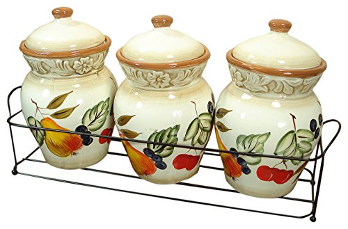 - Information: - 3 piece jar set.- delightfully Hand painted, set makes for a variety of countertop options.- each set includes a metal stand for easy storage