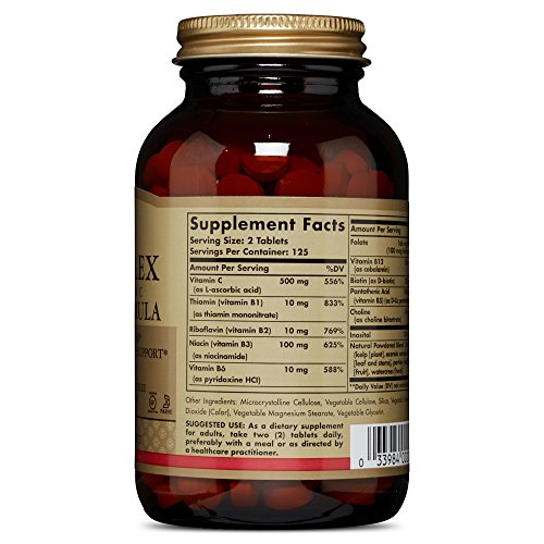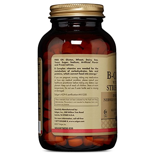 -. Feature : ENHANCED ENERGY - The human body needs B-Complex vitamins for the metabolism of carbohydrates, fats and proteins which is how the body converts food into energy. Each key nutrient found in Vitamin B-Complex plays a unique role in the proper maintenance of metabolic function as well as nutritionally supporting the body during the stresses of everyday life. / ADDITIONAL BENEFITS - Besides metabolic support, the vitamins found in Solgar B-Complex with Vitamin C Stress Formula tablets play a much needed role in supporting healthy cardiovascular and nervous systems. / VITAMIN BREAKDOWN - Solgar Vitamin B-Complex provides the body with a source of vitamins B1, B2, B3, B5, B12, Biotin, Vitamin C and Folic Acid. / SUITABLE FOR VEGANS - All capsules are non-GMO and certified gluten free. They are also free of wheat, dairy, soy, yeast, sugar, sodium, artificial flavors, sweeteners, preservatives and colors.